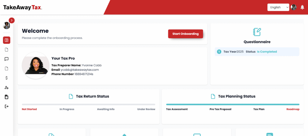TakeAway Tax Client Portal lets you share tax information securely, track your return, and stay in touch with your tax pro in one place. It is designed as a guided, step‑by‑step experience to simplify even complex tax situations.​